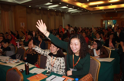 互动不断,上午进行了好玩刺激的抢楼抽奖环节,把会议推向高潮。这个互动环节讲的是快、准,虽然抢到幸运沙发楼层,但是没有答对也只能遗憾地与大奖擦肩而过。幸运的园长就可以领走大奖啦。另一场的互动是抢答环节,主持人以宋芳园长的讲座内容作为问题,完全考不倒专心听讲的园长们。问题一出,园长毫不犹豫地举手,并且准确报出答案,顺利领走奖品。