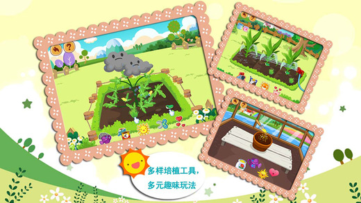 可爱的模拟培植过程,多样的培植工具,让孩子在游戏中,感性认知花朵、水果、蔬菜的成长过程,享受种植的乐趣,体验收获的成就,感受大自然的魅力。游戏中还附有知识介绍卡片,配有语音,丰富孩子对花朵、水果和蔬菜的知识。